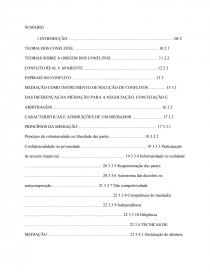 1 INTRODUÇÃO ...................................................................................................... 08 2 TEORIA DOS CONFLITOS .................................................................................. 10 2.1 TEORIAS SOBRE A ORIGEM DOS CONFLITOS ............................................. 11 2.2 CONFLITO REAL E APARENTE ....................................................................... 12 2.3 ESPIRAIS DO CONFLITO ................................................................................. 13 3 MEDIAÇÃO COMO INSTRUMENTO DE SOLUÇÃO DE CONFLITOS ................ 15 3.1 DAS DIFERENÇAS DA MEDIAÇÃO PARA A NEGOCIAÇÃO, CONCILIAÇÃO E ARBITRAGEM ......................................................................................................... 16 3.2 CARACTERISTICAS E ATRIBUIÇÕES DE UM MEDIADOR ............................. 17 3.3 PRINCÍPIOS DA MEDIAÇÃO............................................................................. 17 3.3.1 Princípio da voluntariedade ou liberdade das partes ................................. 18 3.3.2 Confidencialidade ou privacidade ............................................................... 19 3.3.3 Participação de terceiro imparcial ............................................................... 19 3.3.4 Informalidade
